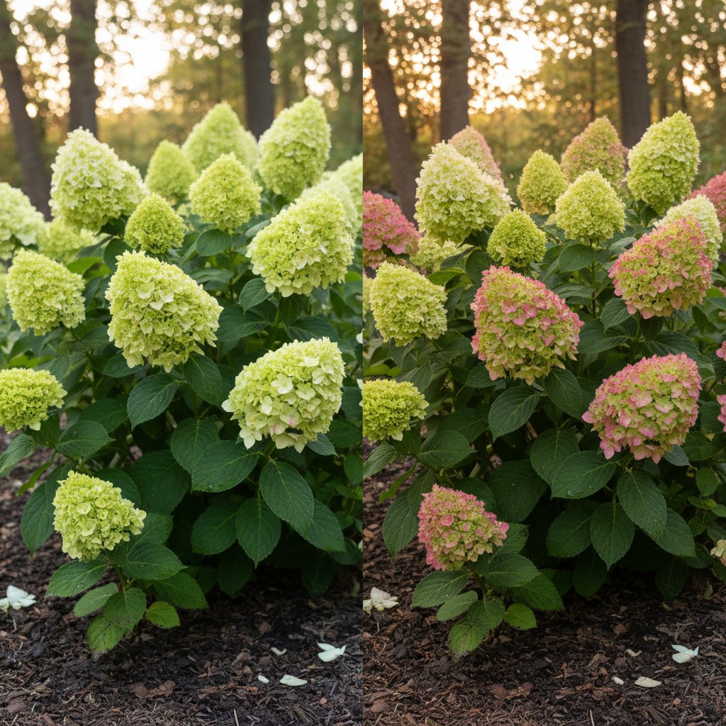Популярная гортензия Limelight завоевала признание благодаря своей уникальной окраске. Крупные соцветия отличаются приятным лимонным оттенком в начале цветения. Со временем оттенок меняется на кремово-белый, а в конце сезона соцветия окрашиваются в светло-розовый. Форма соцветий — коническая, а их размер достигает 30 сантиметров.