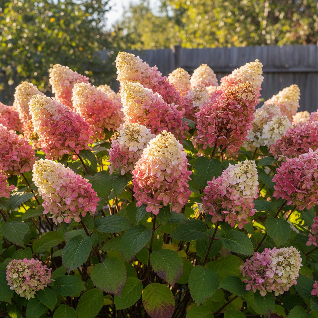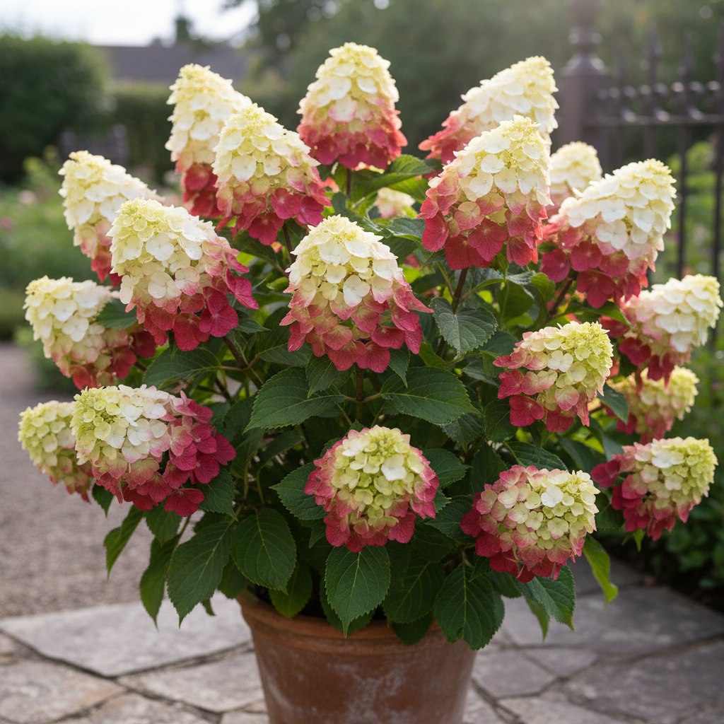 Метельчатая гортензия Фантом — это очень нарядный и эффектный сорт. Обильное цветение и красивая густая листва привлекают внимание ландшафтных дизайнеров. Соцветия пирамидальной формы меняют свою окраску в зависимости от стадии цветения: