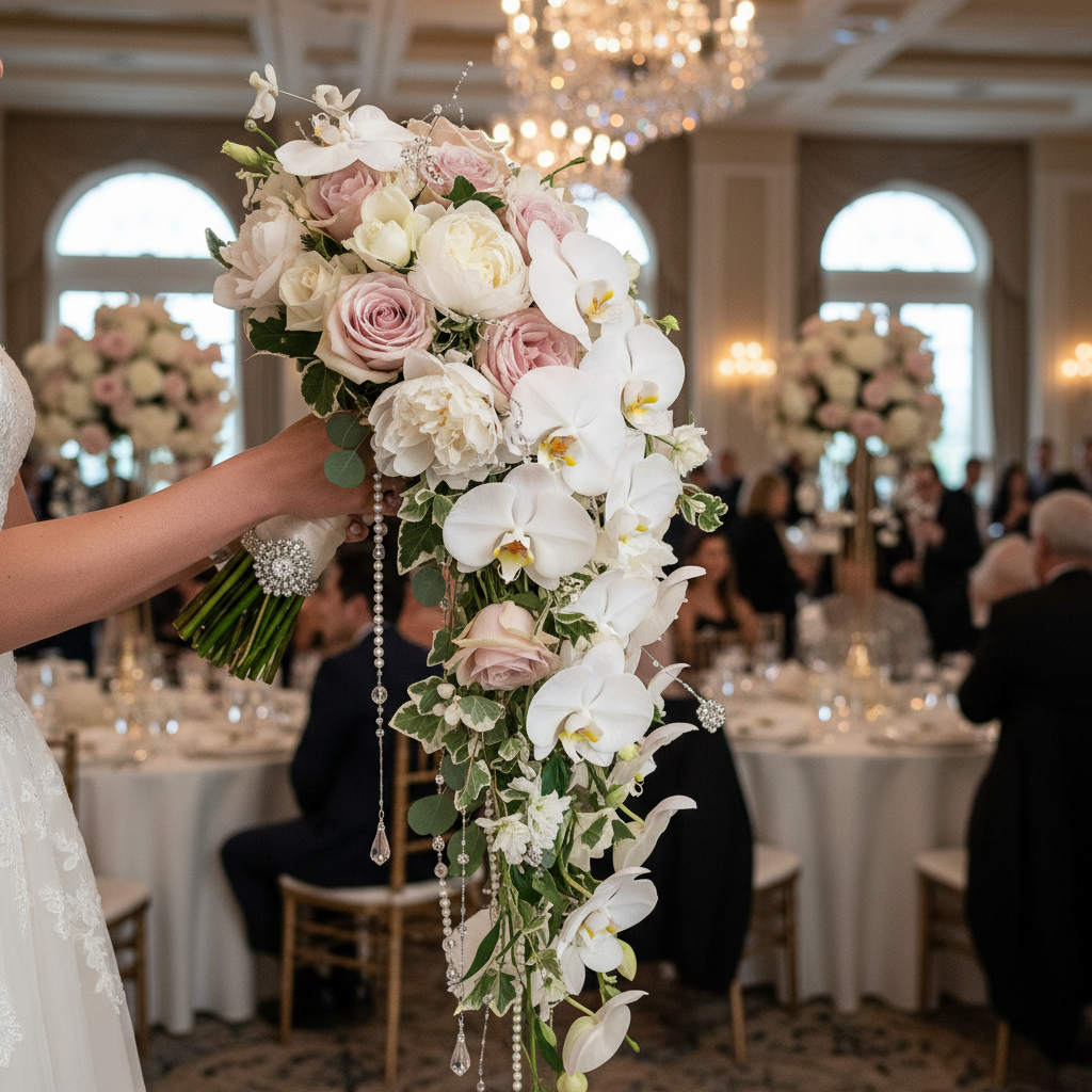 Каскадный букет. Шикарный и необычный, как цветочный водопад в руках. Круто смотрится на больших, важных свадьбах.