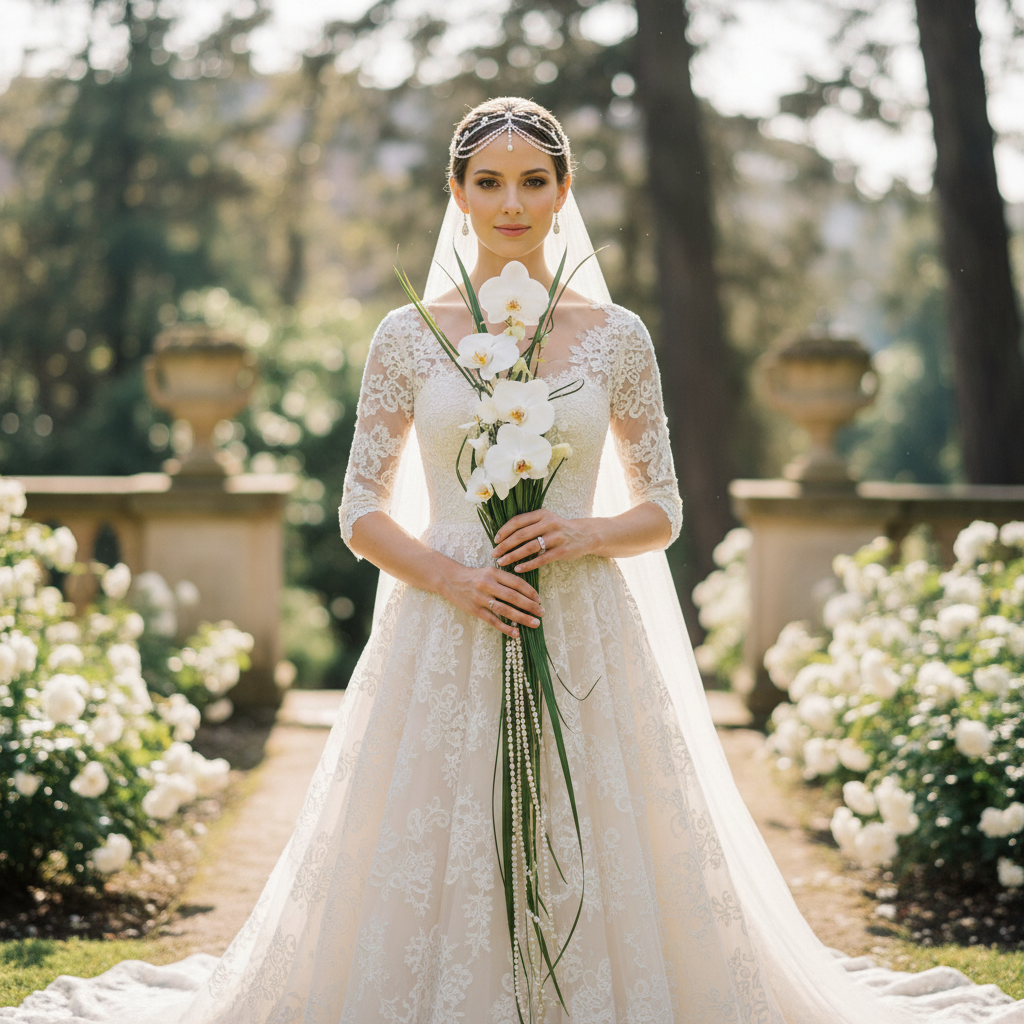 Букет-скипетр. Такой длинный и изящный, подчеркивает красоту невесты. Она держит его как скипетр.
