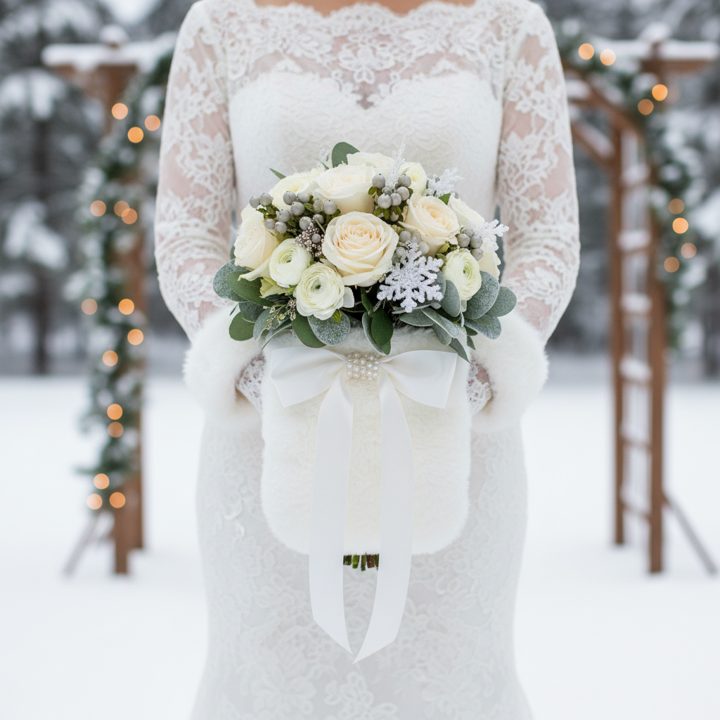Букет-муфта. Классная идея для зимней свадьбы. Цветы прячут в муфту, чтобы рукам было тепло, и выглядит необычно. Он то в моде, то нет, но всегда смотрится круто.