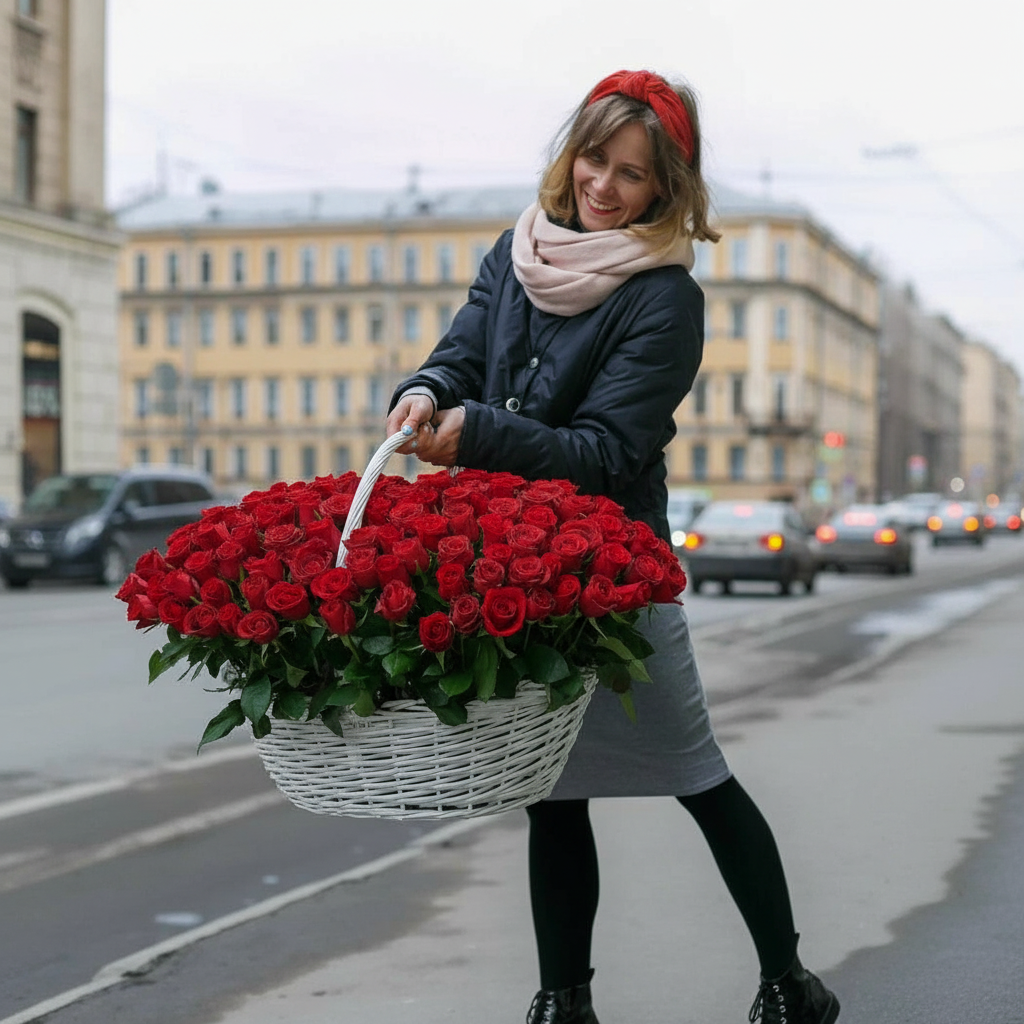 И по нашему мнению, такая композиция - это корзина со 151 розой! Это гигантская цветочная композиция! Она очень похожа на небольшую летнюю лужайку из роз. Невероятно шикарное зрелище! Такая корзина из роз расскажет возлюбленной о вашей огромной любви и еще о чем-то большем, что у вас есть! Например, о предложении быть вместе следующие несколько десятилетий.