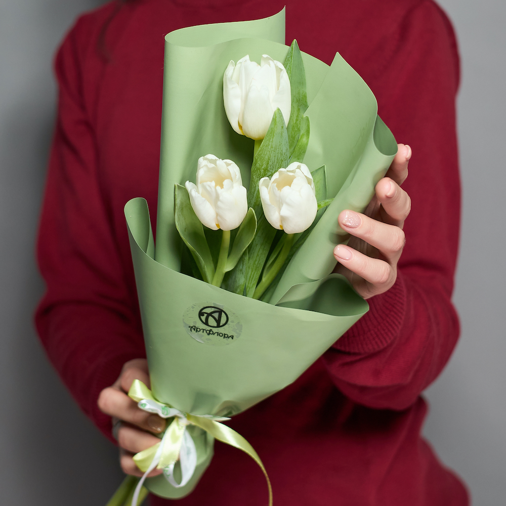 3 белых тюльпана в корейской упаковке
