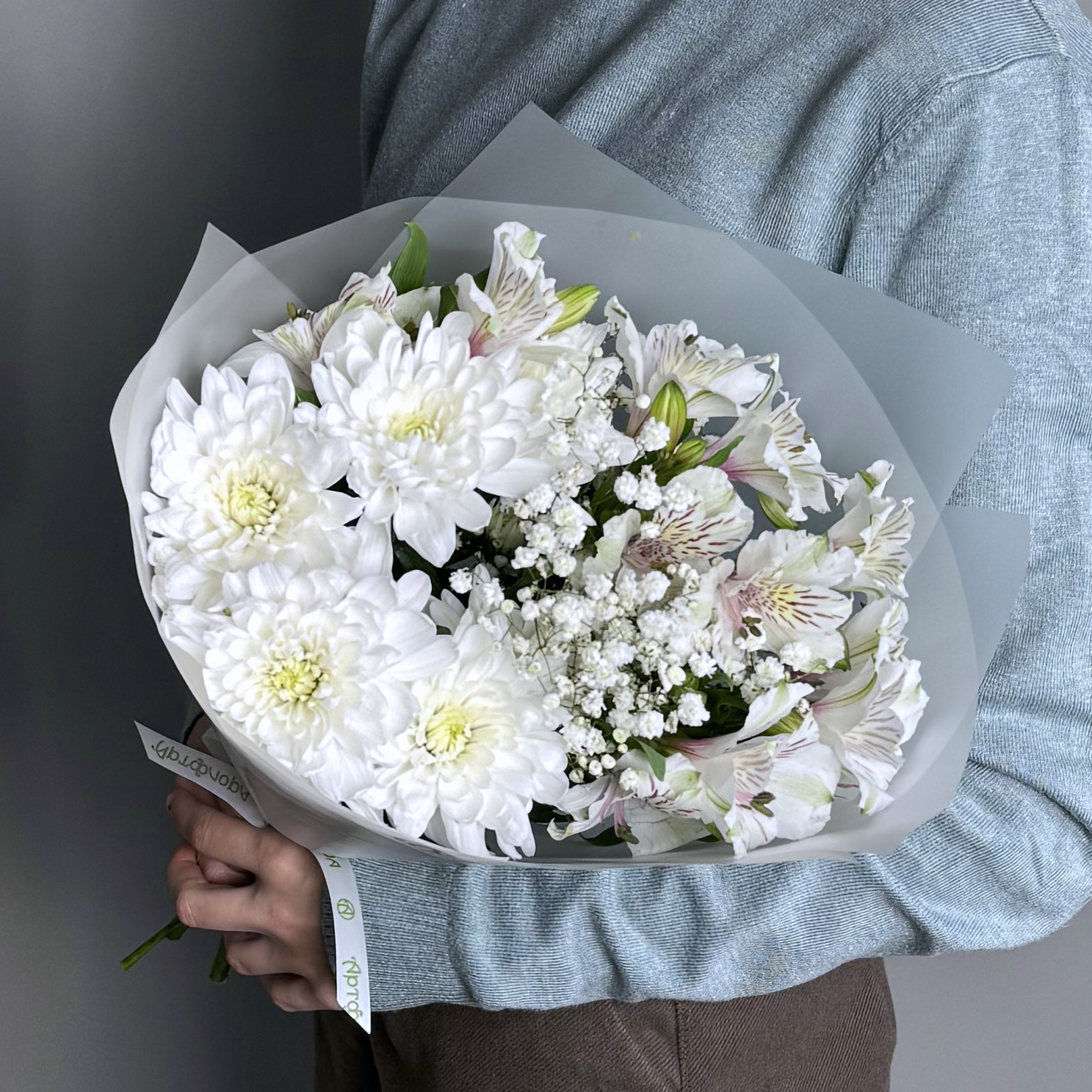 Белоснежный букет из кустовой хризантемы, алстромерий и гипсофилы