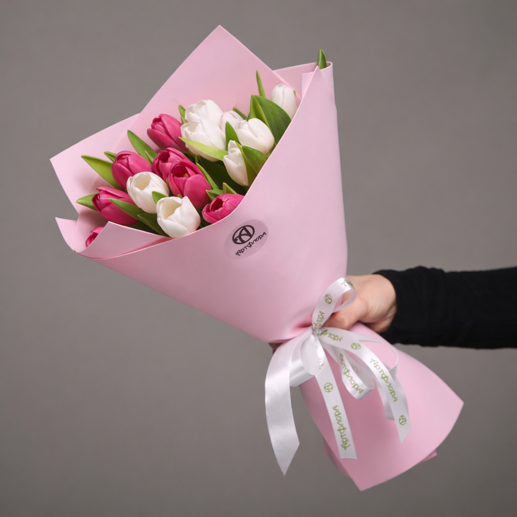Букет из 15 белых и малиновых тюльпанов (Голландия) в фоамиране