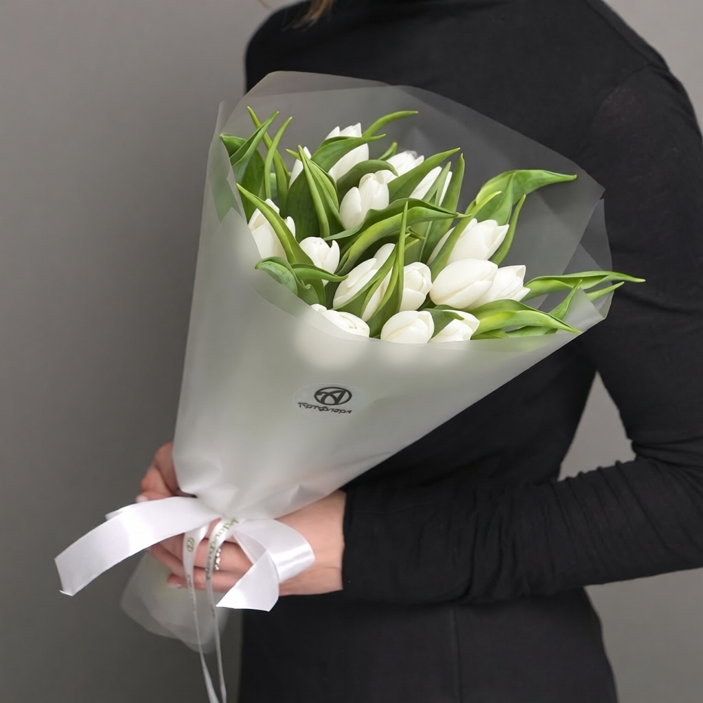 Букет из 15 белых тюльпанов (Голландия) в корейской матовой упаковке