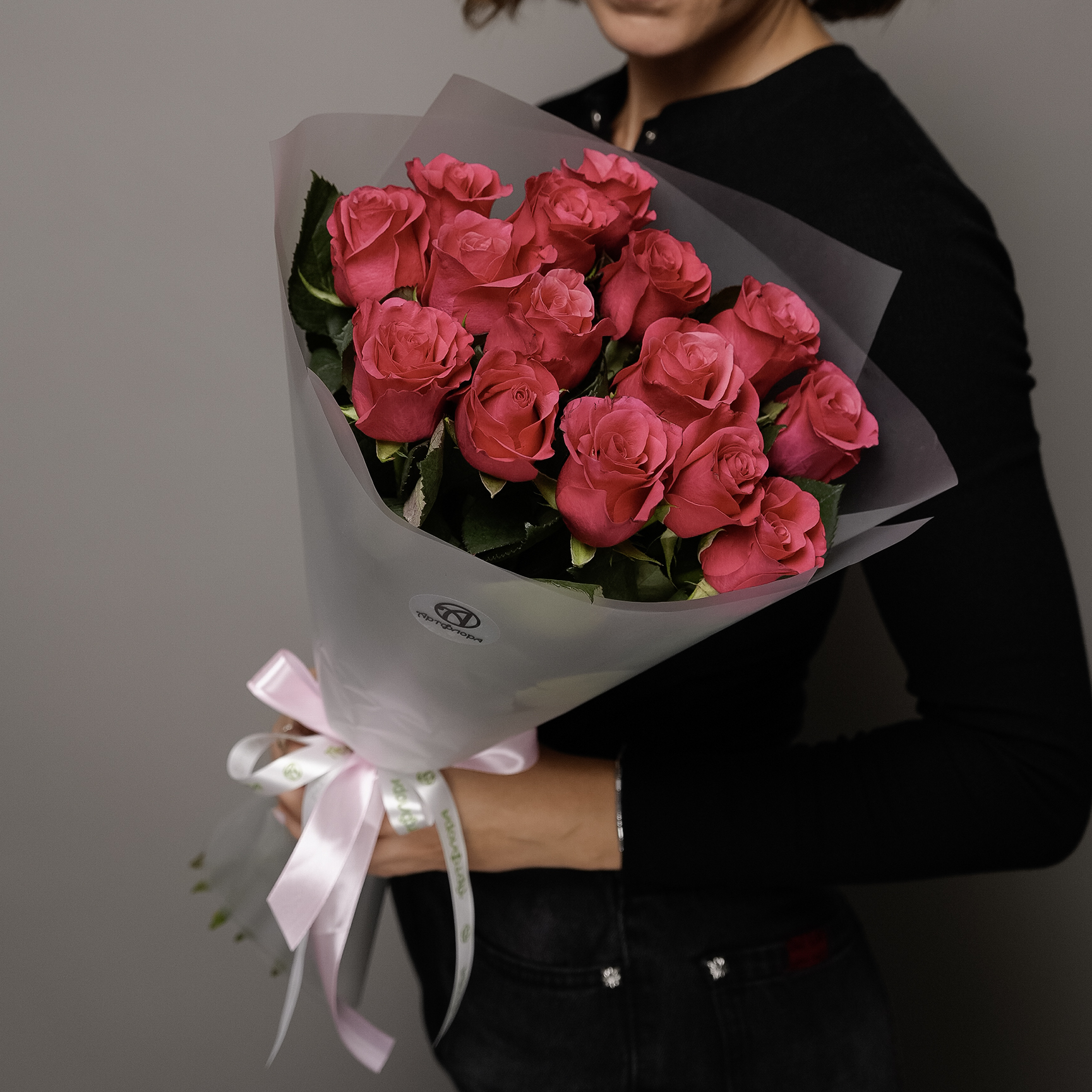 Букет из 15 малиновых роз 50 см (Кения) в корейской матовой упаковке