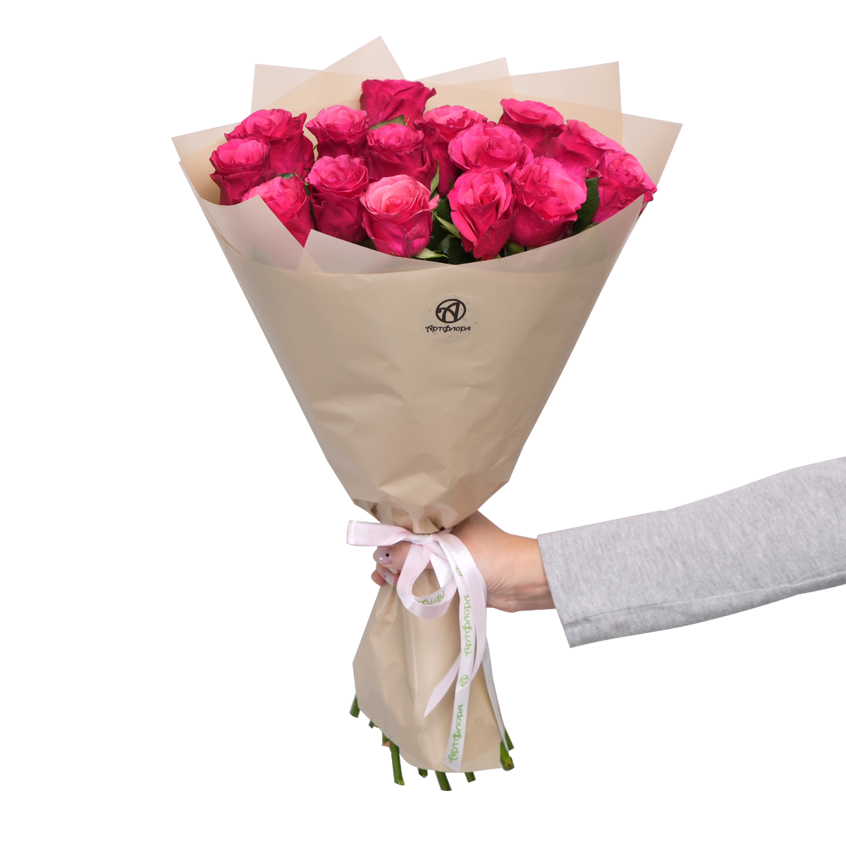 Букет из 15 малиновых роз Кения (50 см) в корейской упаковке