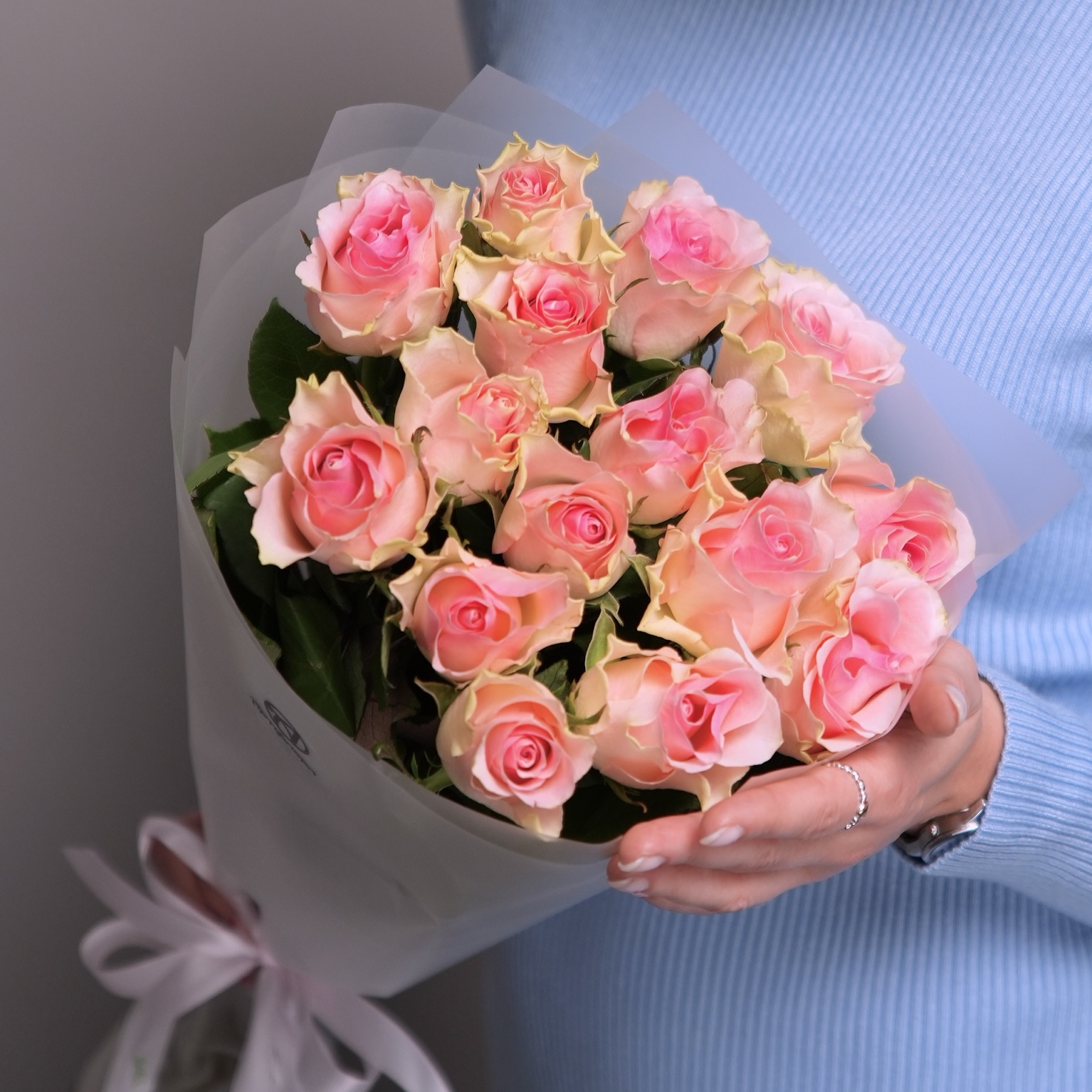 Букет из 15 светло-розовых роз 50 см (Кения) в корейской матовой упаковке