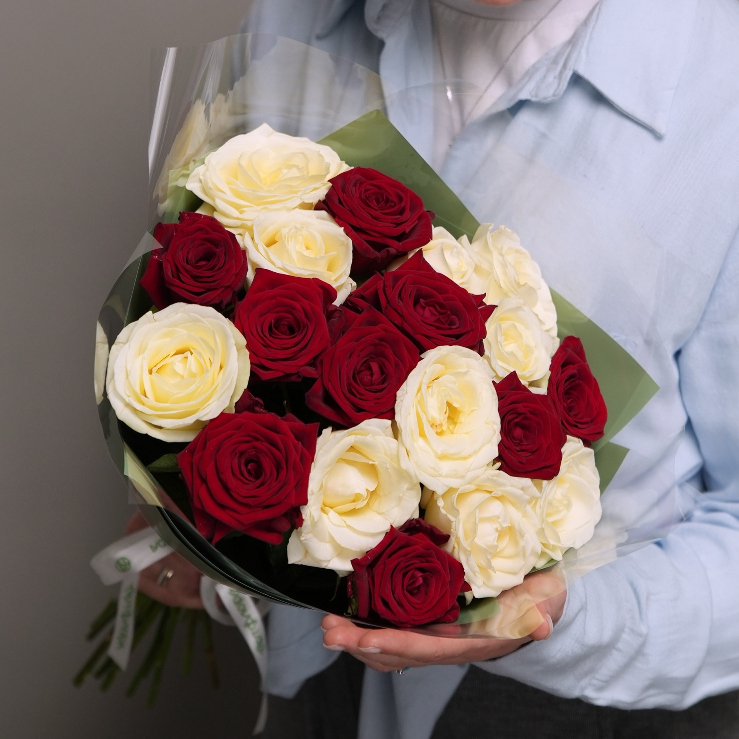 Букет из 19 красных и белых роз 50 см (Россия) в двойной корейской упаковке