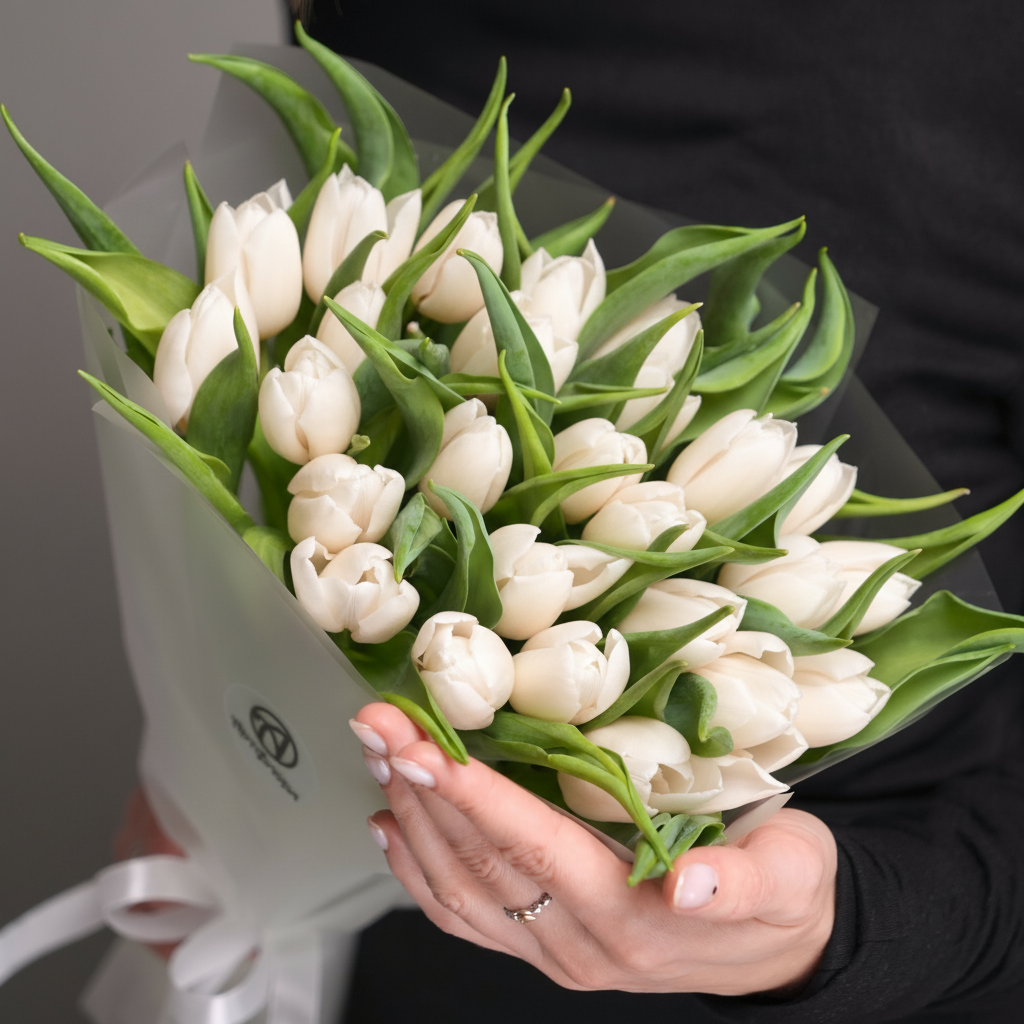 Букет из 25 белых тюльпанов (Голландия) в корейской матовой упаковке