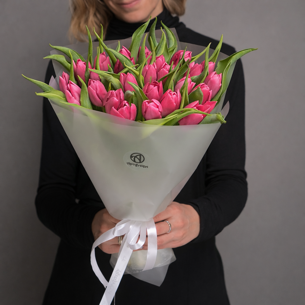 Букет из 25 малиновых тюльпанов (Голландия) в корейской матовой упаковке