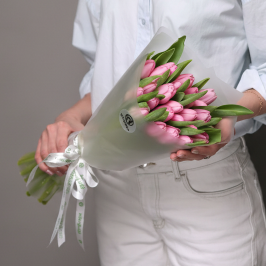 Букет из 25 розовых тюльпанов (Голландия) в корейской матовой упаковке