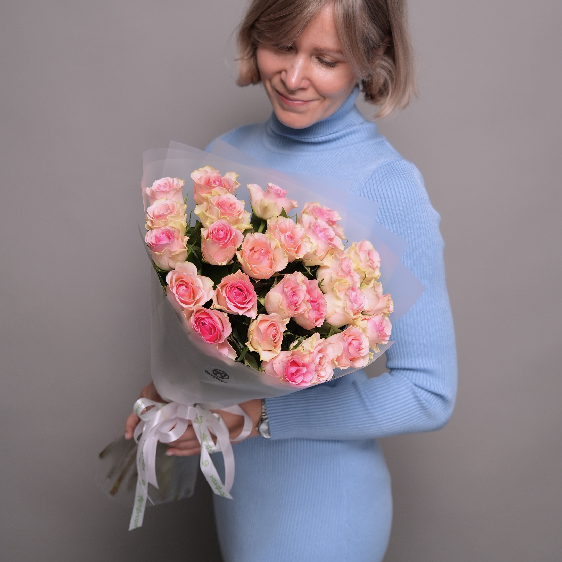 Букет из 25 светло-розовых роз 50 см (Кения) в корейской матовой упаковке
