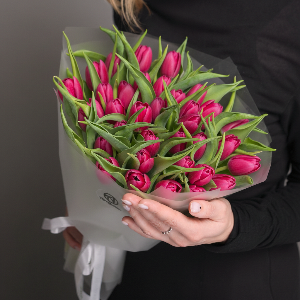 Букет из 35 малиновых тюльпанов (Голландия) в корейской матовой упаковке — это насыщенная композиция, которая сочетает в себе яркость цвета, качество голландских тюльпанов и стиль современного оформления. Малиновый оттенок ассоциируется с энергией, теплом и тёплым вниманием — эмоциями, которые хочется выразить самым значимым людям в вашей жизни.