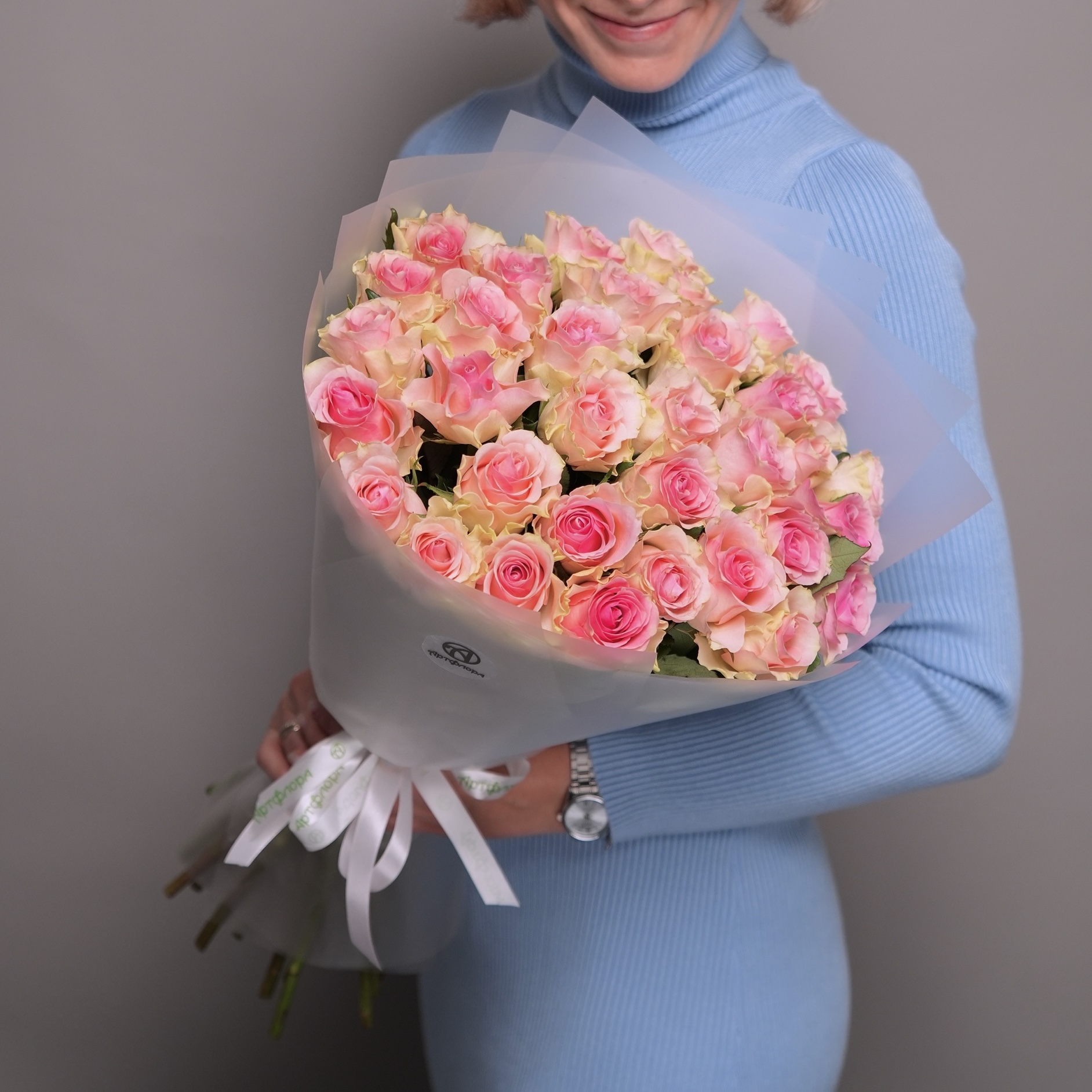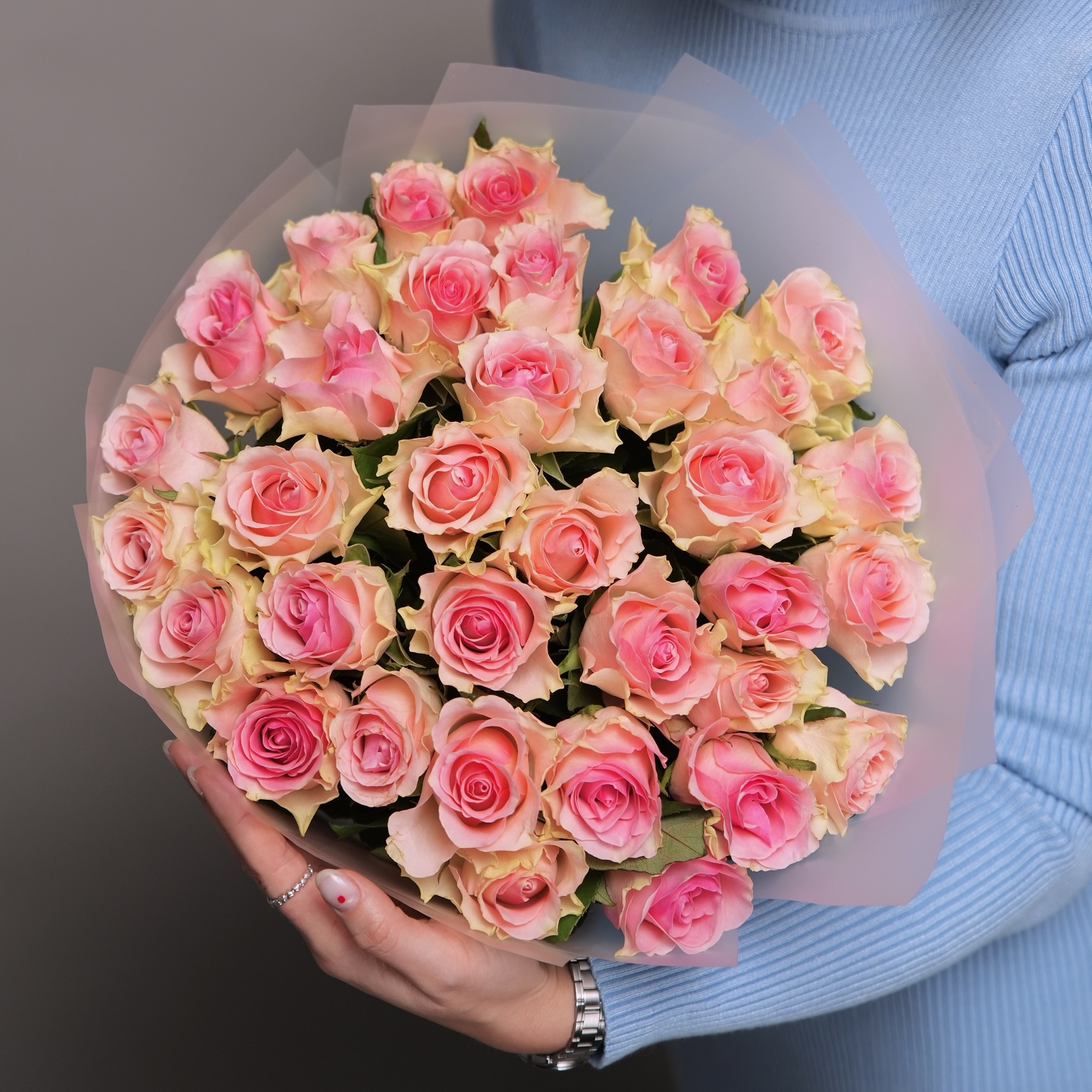 Этот пышный и сбалансированный букет из 35 роз — идеальный способ выразить глубокие чувства. Изысканный нежно-розовый оттенок символизирует искреннее восхищение, нежность и заботу. Такое количество цветов выглядит щедро и празднично, создавая яркое впечатление и передавая всю силу вашего внимания.