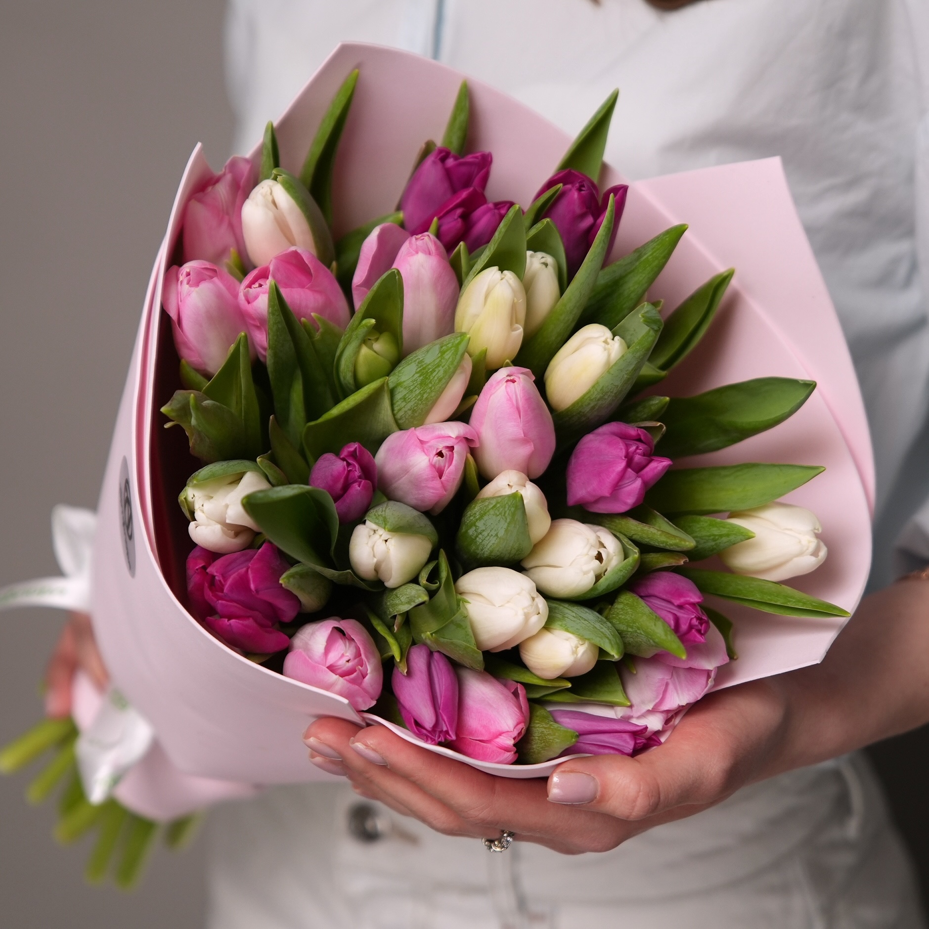 Если хочется подарить букет, который сразу привлекает взгляд и вызывает улыбку, обратите внимание на букет из 35 тюльпанов микс «Нежный» (Голландия) в фоамиране. Это сочетание свежих тюльпанов с мягкими, светлыми оттенками, оформленных в стильный фоамиран — современный материал, придающий композиции аккуратный объём и шарм.