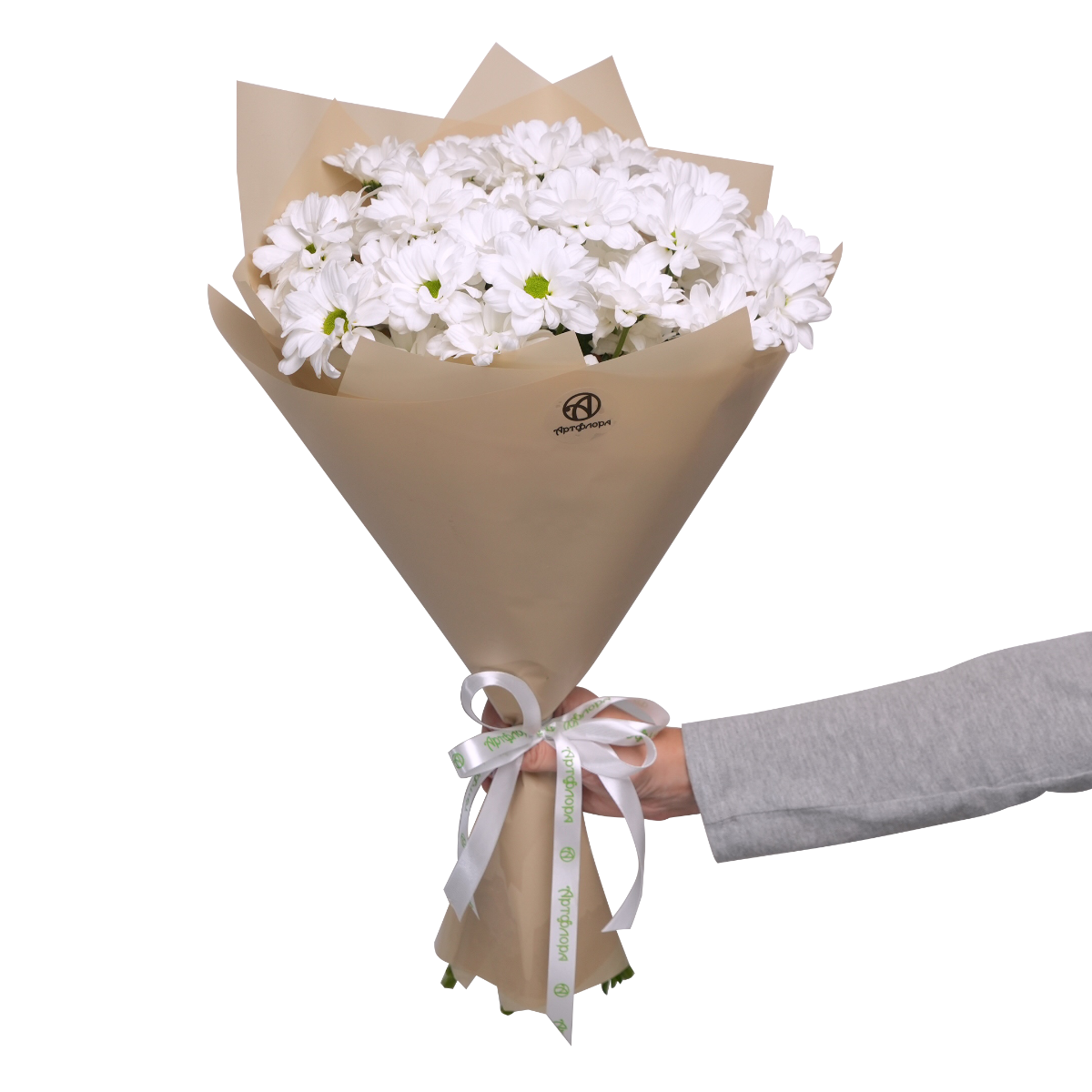 Букет из 5 белых кустовых хризантем ромашка (Бакарди) в корейской упаковке