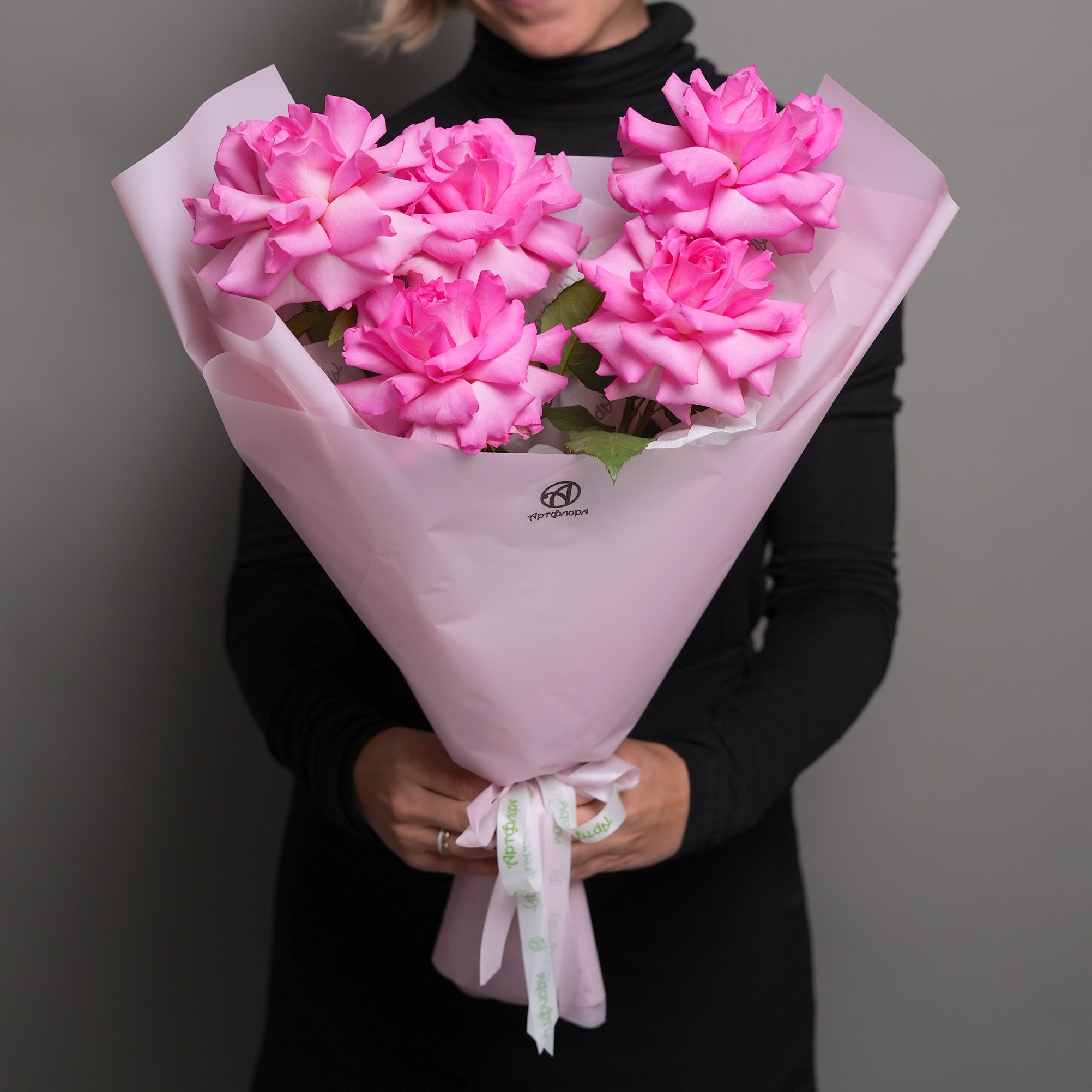 Букет из 5 ярко-розовых французских роз в корейской упаковке