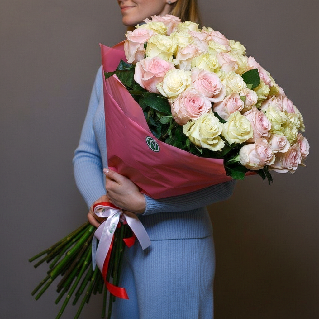 Букет из 51 белой и розовой розы 70 см (Эквадор)