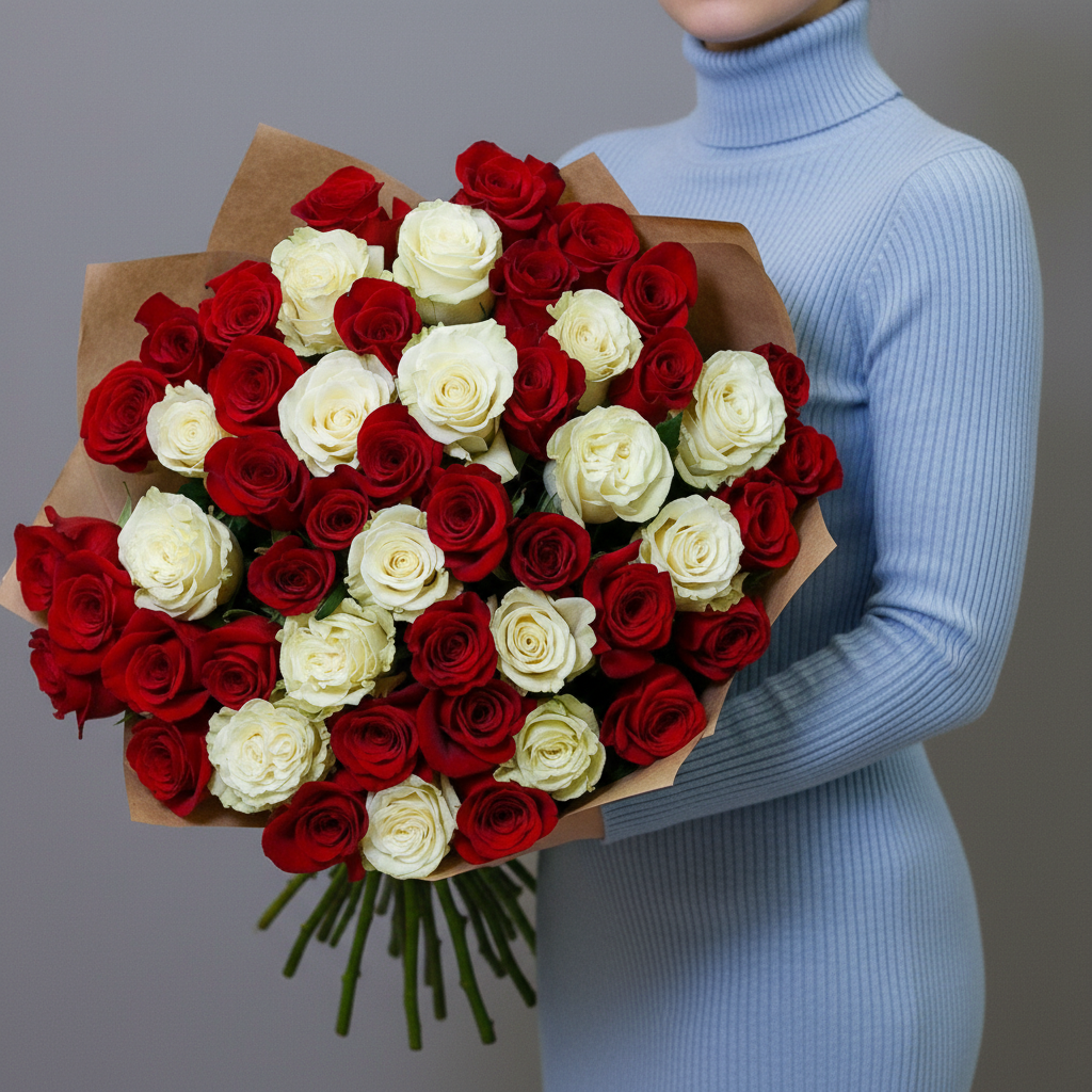 Букет из 51 красной и белой розы 50 см (Эквадор)