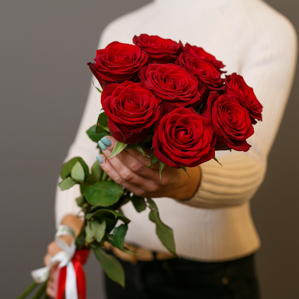 Букет из 7 красных роз 50 см (Эквадор) с атласной лентой
