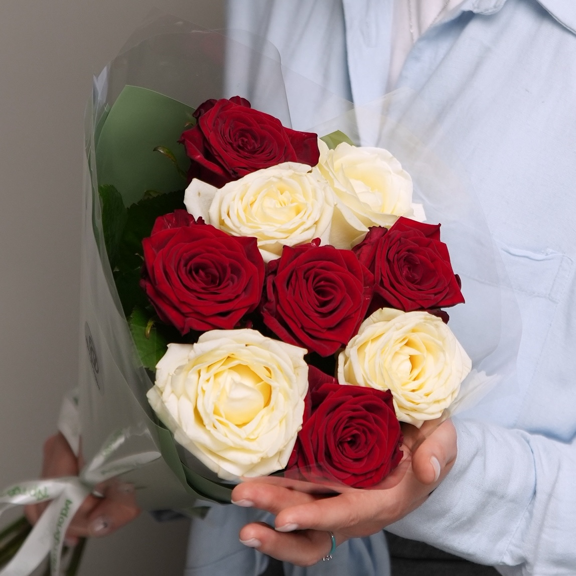 Букет из 9 красных и белых роз 50 см (Россия) в двойной корейской упаковке