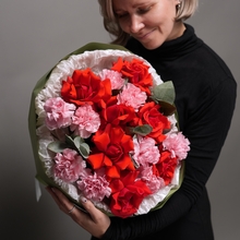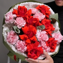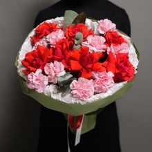 Букет из алых французских роз и диантусов - L в корейской упаковке