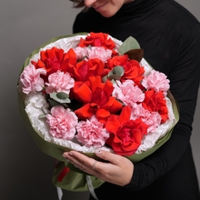 Букет из красных французских роз и диантусов — воплощение силы чувств и элегантной классики. В составе — крупные розы насыщенно-алого оттенка и нежные диантусы, подчёркивающие фактуру и глубину композиции. Легкий аромат роз и свежие ветви эвкалипта придают букету утончённость и благородство.
