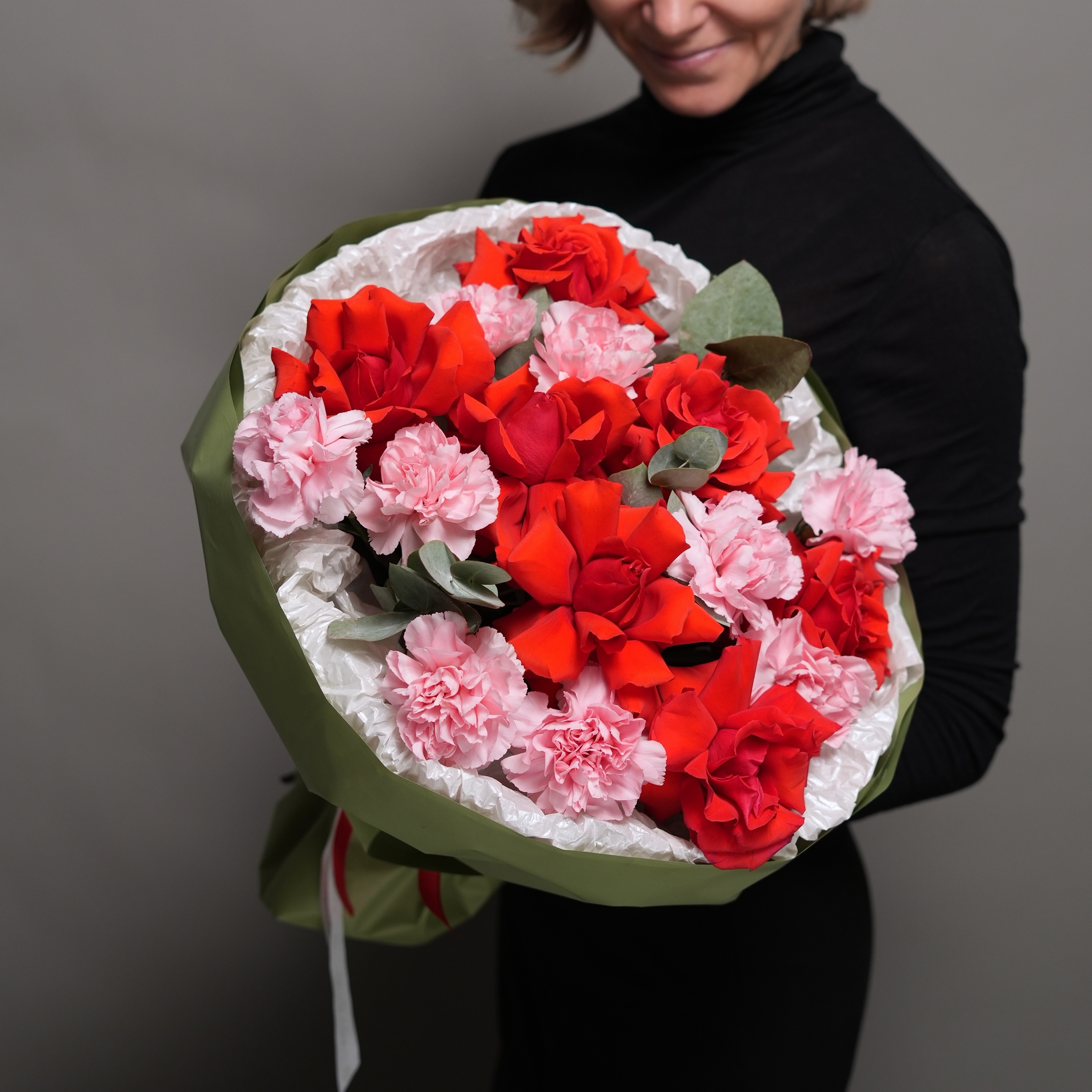 Букет из красных французских роз и диантусов — воплощение силы чувств и элегантной классики. В составе — крупные розы насыщенно-алого оттенка и нежные диантусы, подчёркивающие фактуру и глубину композиции. Легкий аромат роз и свежие ветви эвкалипта придают букету утончённость и благородство.