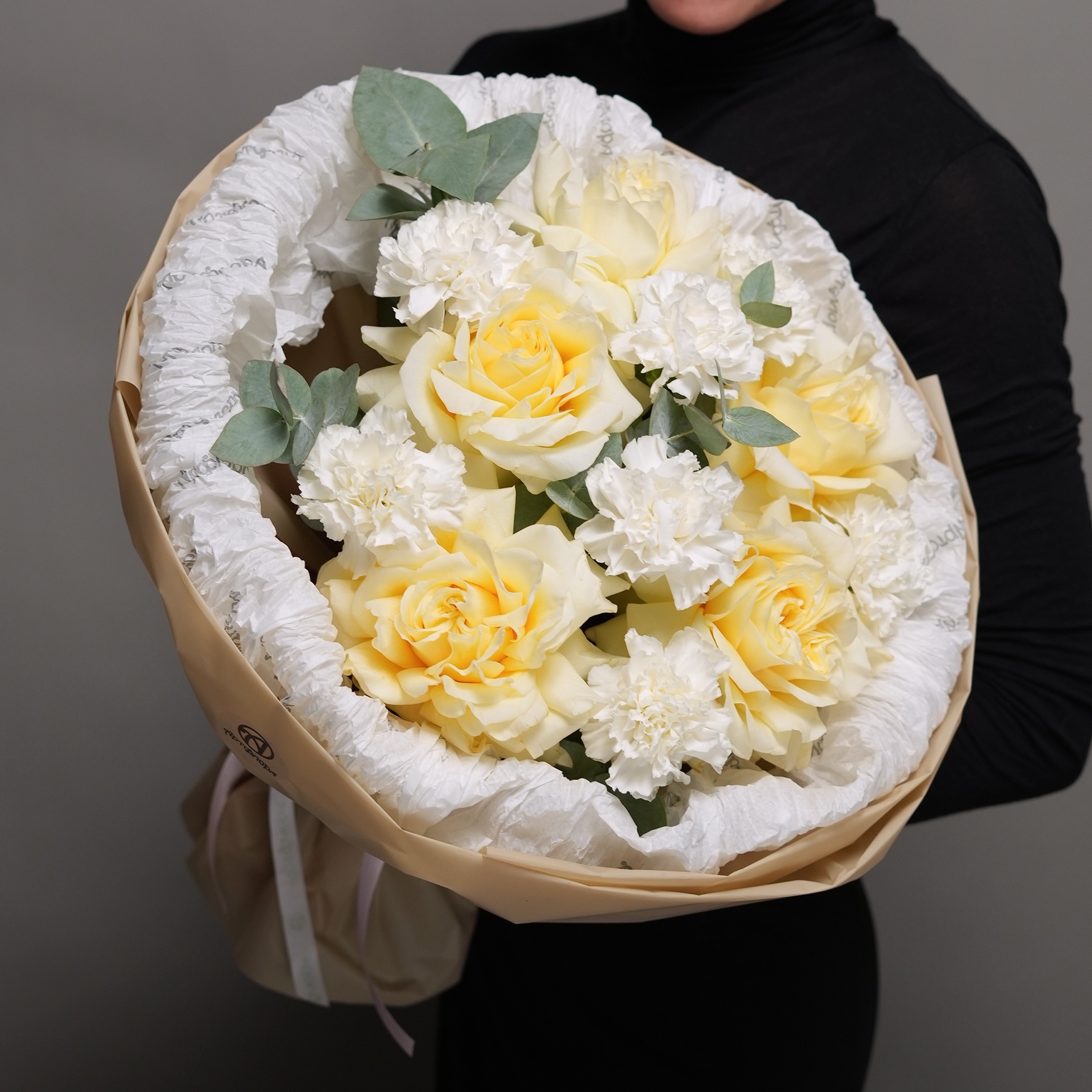 Букет из кремовых французских роз и диантусов с эвкалиптом - М в корейской упаковке