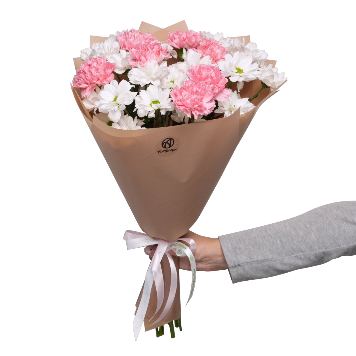 Букет из кустовых белых хризантем с розовым диантусом в корейской упаковке