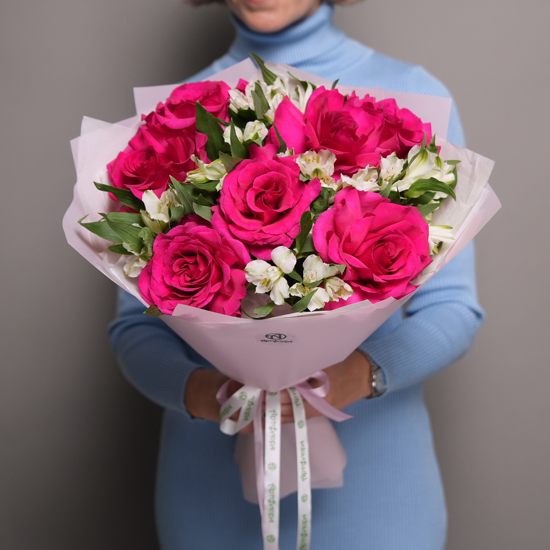 Чем особенен этот букет? Сочетание насыщенных малиновых роз и нежных белых альстромерий выглядит очень свежо и современно. Букет получается крупным (размер L), пышным и сразу привлекает внимание.