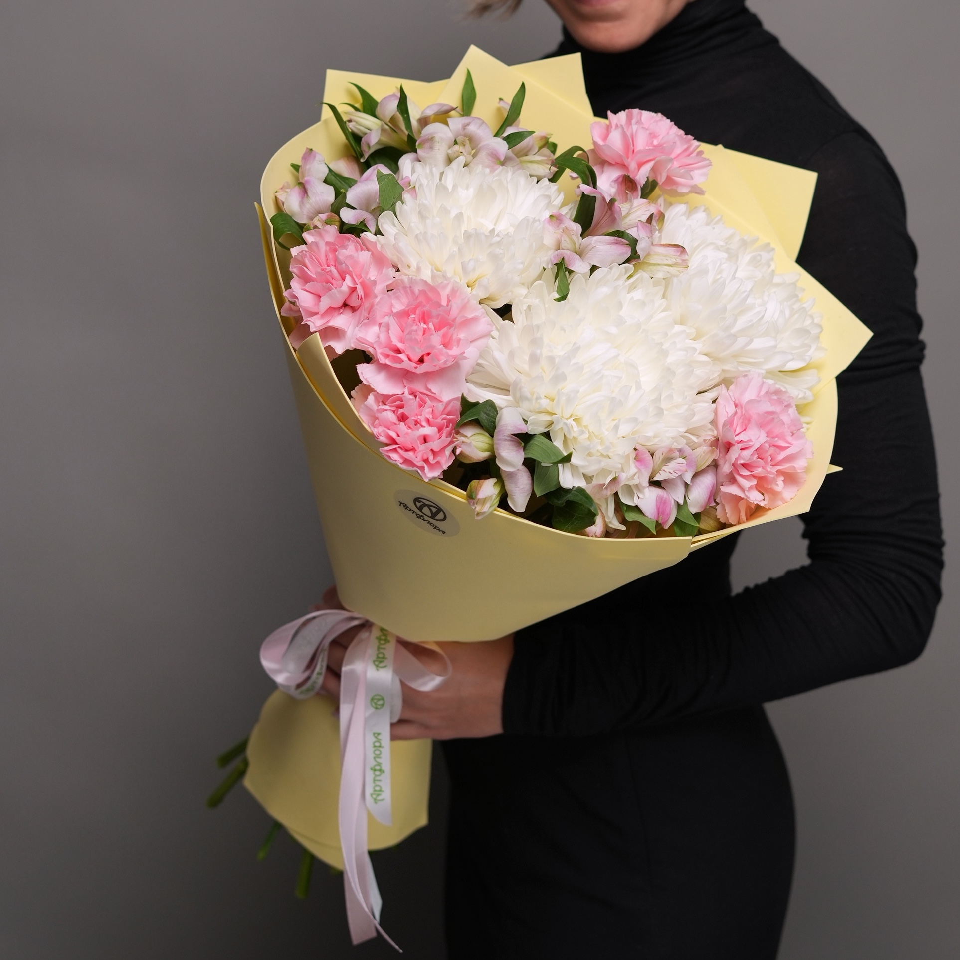 Букет из одноголовой хризантемы, диантусов и альстромерий - M в фоамиране