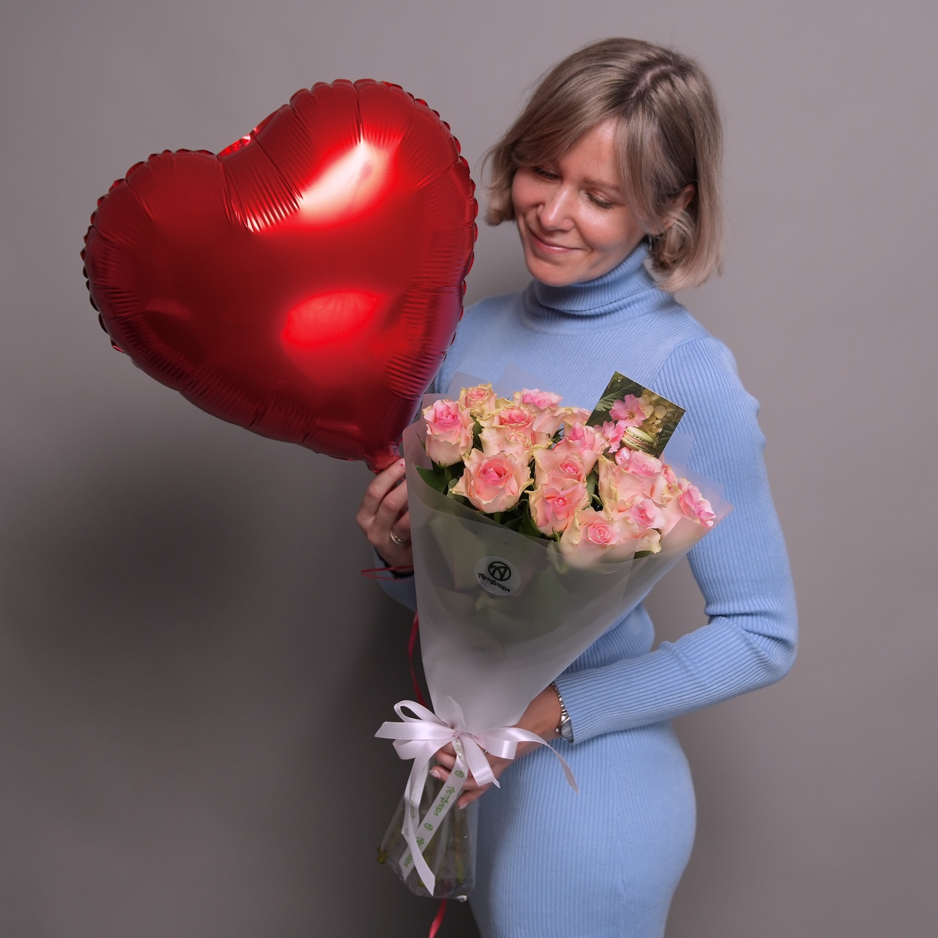 Набор размер M с букетом 15 светло-розовых роз Кения (50 см) в корейской матовой пленке