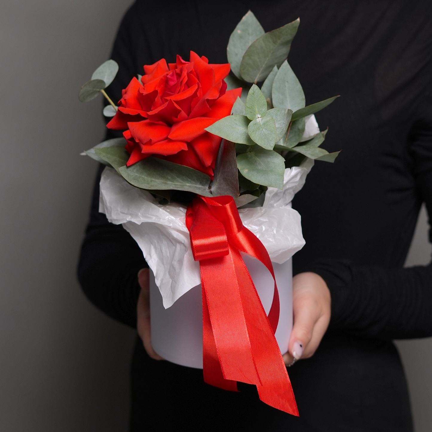 Букет упакован в шляпную коробку, что делает его не только эстетически привлекательным, но и практичным. Вам не потребуется ваза — коробка сохраняет свежесть и красоту цветов долгое время, одновременно служа элементом декора. Такая упаковка подчёркивает эксклюзивность подарка, добавляет ему современности и утонченности.
