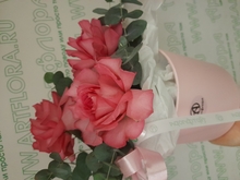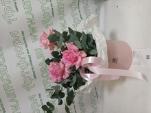 Одним из ключевых преимуществ данного букета является его стильная шляпная коробка. Она не только делает букет эстетически завершённым, но и исключает необходимость в вазе. Это продуманное решение позволяет сохранять свежесть и красоту цветов длительное время, обеспечивая простоту в уходе и транспортировке. Шляпная коробка также добавляет нотку современности и изысканности, делая букет роскошным элементом декора для любого интерьера.