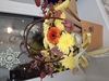 Сумочка с мини-герберой оранжевой, хризантемой кустовой желтой, солидаго и листьями дуба