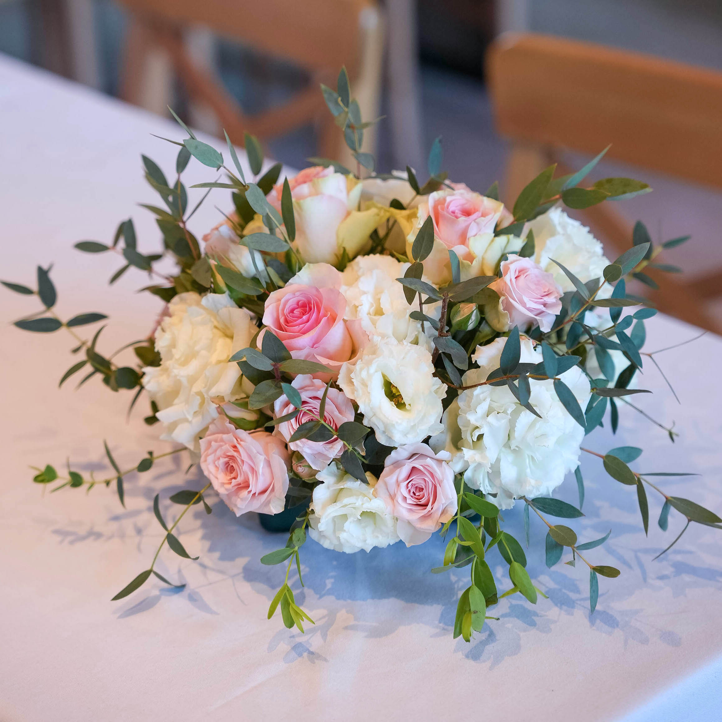 Заказывайте свадебную композицию на стол гостей из кустовых роз, лизиантусов и роз Кения с доставкой по Санкт-Петербургу и Ленинградской области.