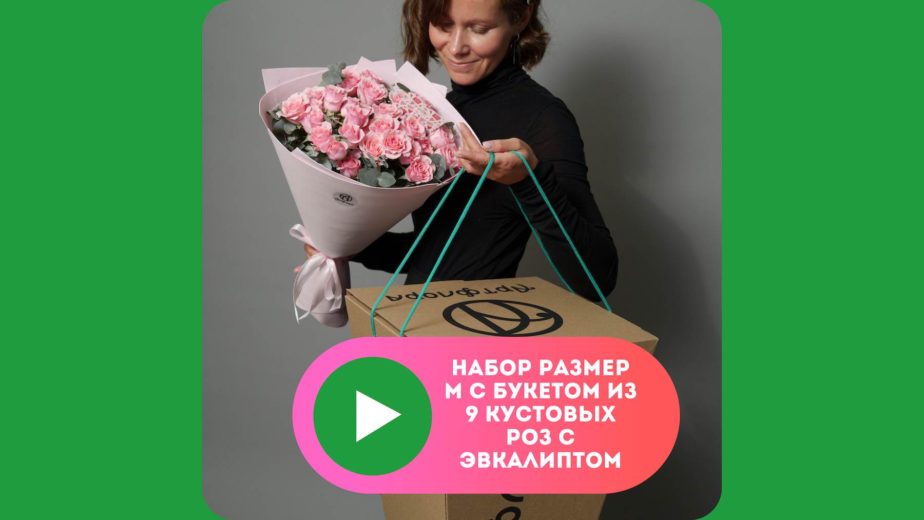 Набор размер M с букетом из 9 кустовых роз с эвкалиптом в фоамиране