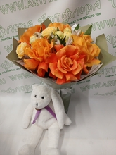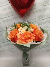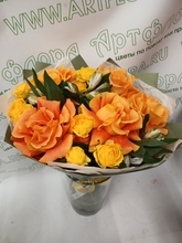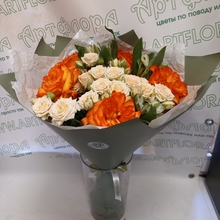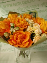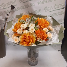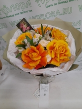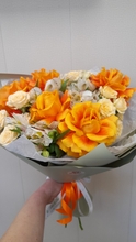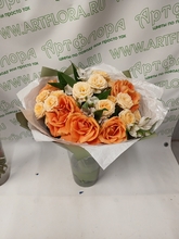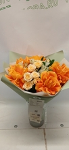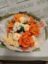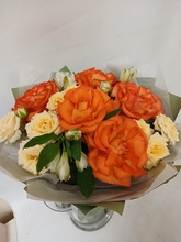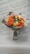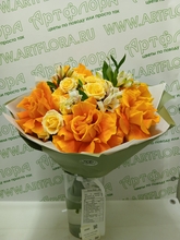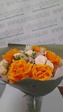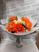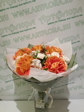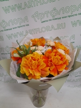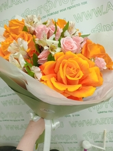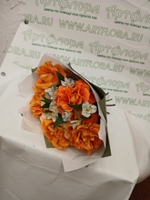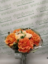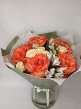 Букет из оранжевых французских роз, кустовых роз и альстромерий — это взрыв теплых эмоций и солнечного настроения! Идеальный выбор для тех, кто хочет выразить яркие чувства, подчеркнуть индивидуальность и создать атмосферу праздника.
